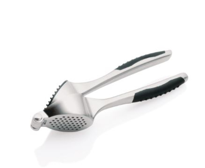 Pozinkovaný lis na česnek s rukojetí s plastovými vložkami pro pohodlnější použití.
